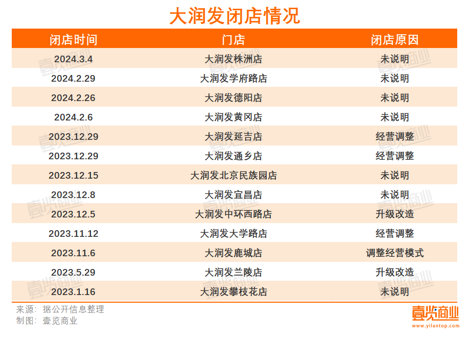 据不完全统计,2023年1月至今,至少有13家大润发闭店或宣布闭店,涉及湖南、江苏、湖北、四川等多个省份,闭店原因主要为租约到期和经营调整。其中,2018年年底开业的攀枝花店仅支撑了四年就正式倒闭。看到曾经的“陆战之王”频繁关店,难免会有些唏嘘。