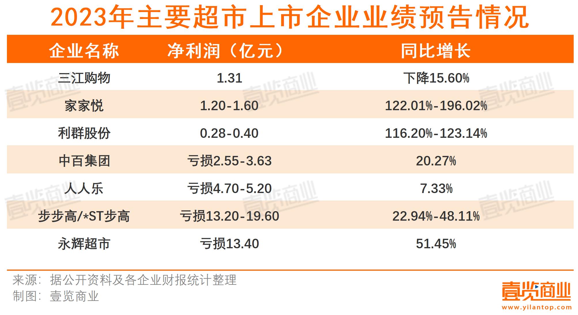 从营收数据上看,根据六家上市超市已经发布的2023年的业绩预报,除了三江购物、家家悦与利群股份是盈利状态,其他几家大型超市企业均面临巨额亏损,以永辉为最。2023年永辉预计亏损13.4亿元,亏损金额是三江购物盈利的十倍多。
