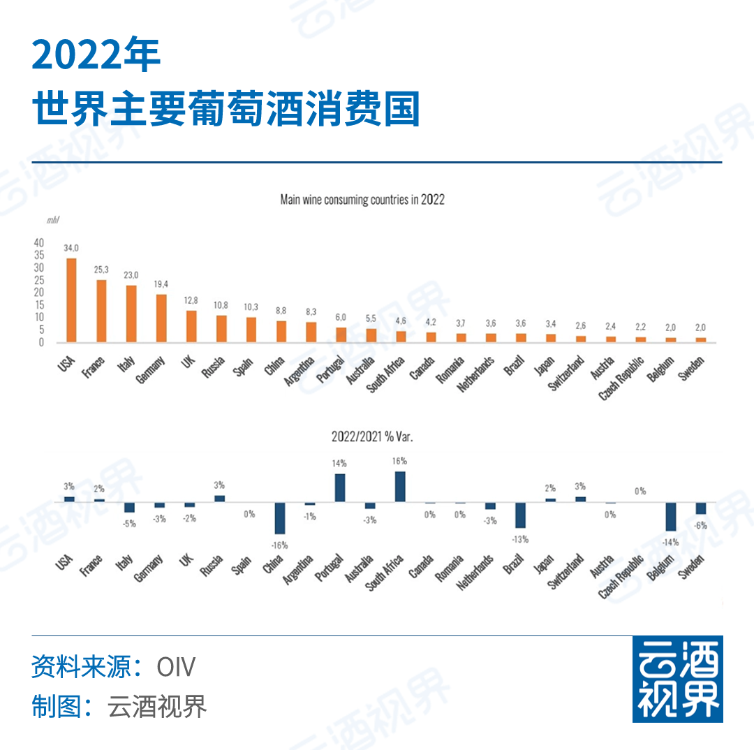 国际葡萄与葡萄酒组织OIV报告显示,自2018年以来,中国的葡萄酒消费量平均每年减少200万升,2022年中国葡萄酒消费量在8.8亿升,下降16%,在22个被统计国家中位列第八位。