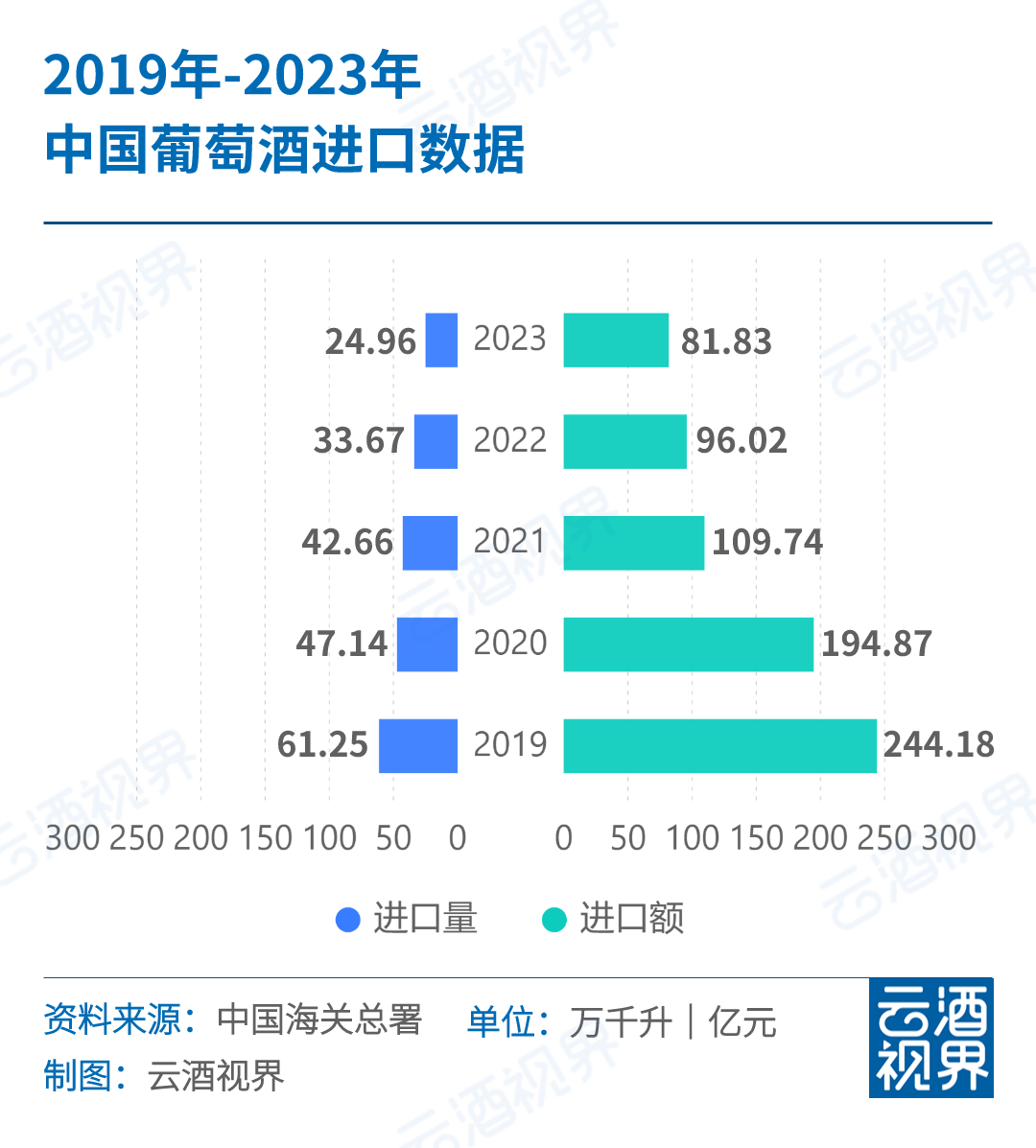 海关数据显示,2023年中国进口葡萄酒市场继续收缩至81.83亿元,同比下降19.14%;进口量仅有24.9万千升,同比下降25.75%。法国、智利、意大利、西班牙、美国等主要葡萄酒进口来源国的进口量均在下滑。