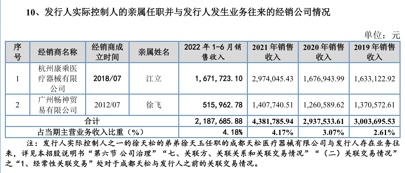 据天松医疗2023年1月的说明书,在客户中,由离职员工出资设立或者由离职员工担任董事、监事、高级管理人员的经销商有11家,离职员工任职的经销商9家,实际控制人之一徐天松的亲属任职的经销商2家。这许多经销商合计实现的销售收入在能占到当期主营业务收入比重超20%。