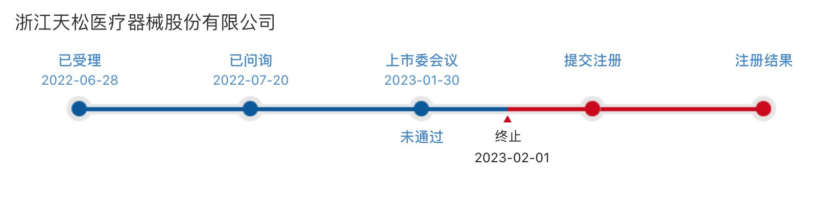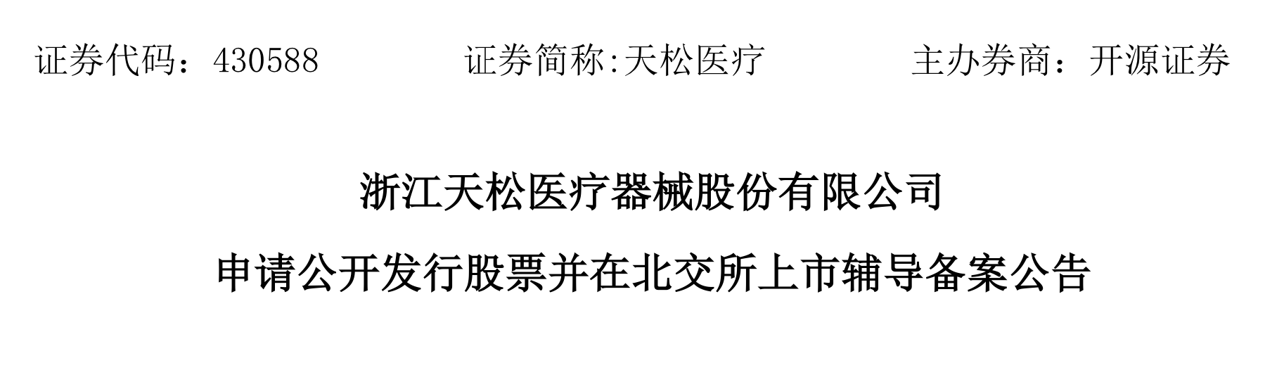 2021年6月16日,天松医疗与财通证券签署在全国中小企业股份转让系统发行股票并在精选层挂牌的辅导协议。2021年6月23日浙江证监局受理并进行了公示。不过在2022年1月12日,天松医疗与财通证券协商一致,终止了此次申请,并向浙江证监局提交了终止辅导备案材料。