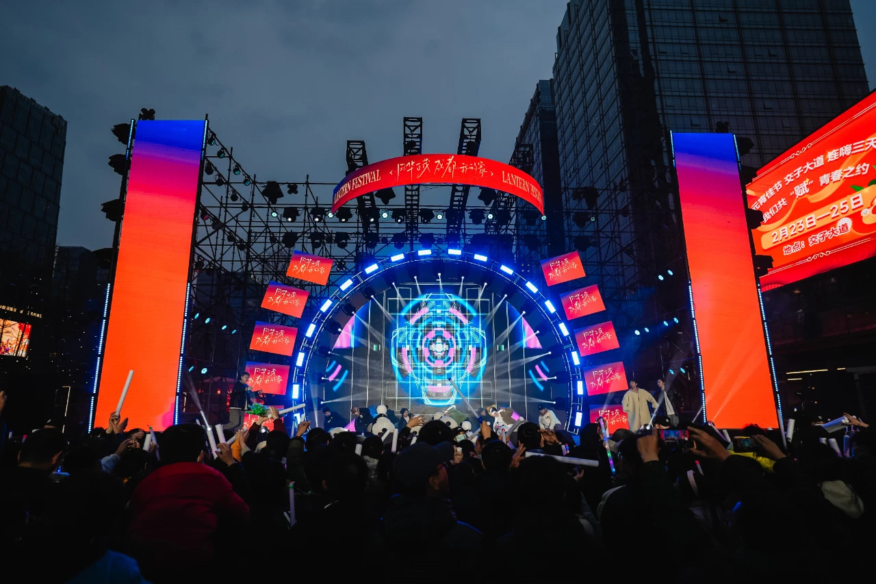 此外,现场LED屏幕与演出舞台充分互动,塔上、塔下交互体验,大小屏融合实时直播,不仅充分满足现场青年、网友和市民的参与需求,更展示出了成都高新区在文化传承与创新上的技术优势。
