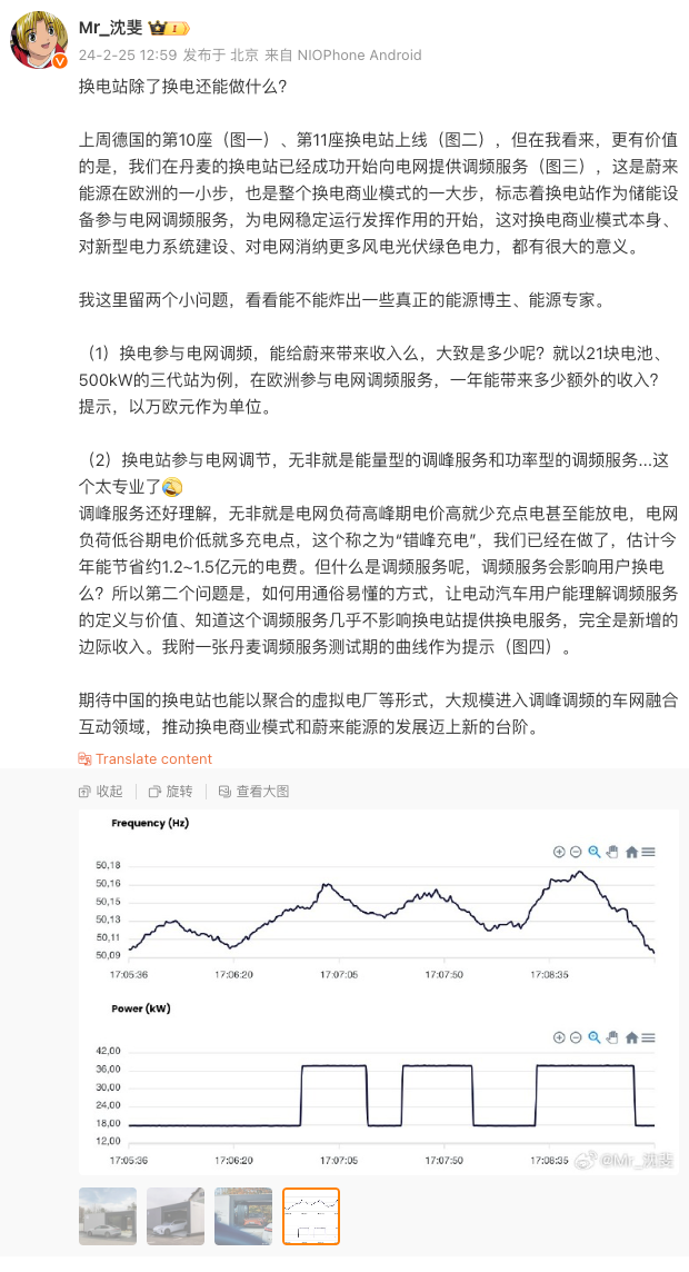2月25日,蔚来副总裁沈斐在微博发文称,在丹麦的换电站已经成功开始向电网提供调频服务,这是蔚来能源在欧洲的一小步,也是整个换电商业模式的一大步,标志着换电站作为储能设备参与电网调频服务。沈斐表示,期待中国的换电站也能以聚合的虚拟电厂等形式,大规模进入调峰调频的车网融合互动领域。