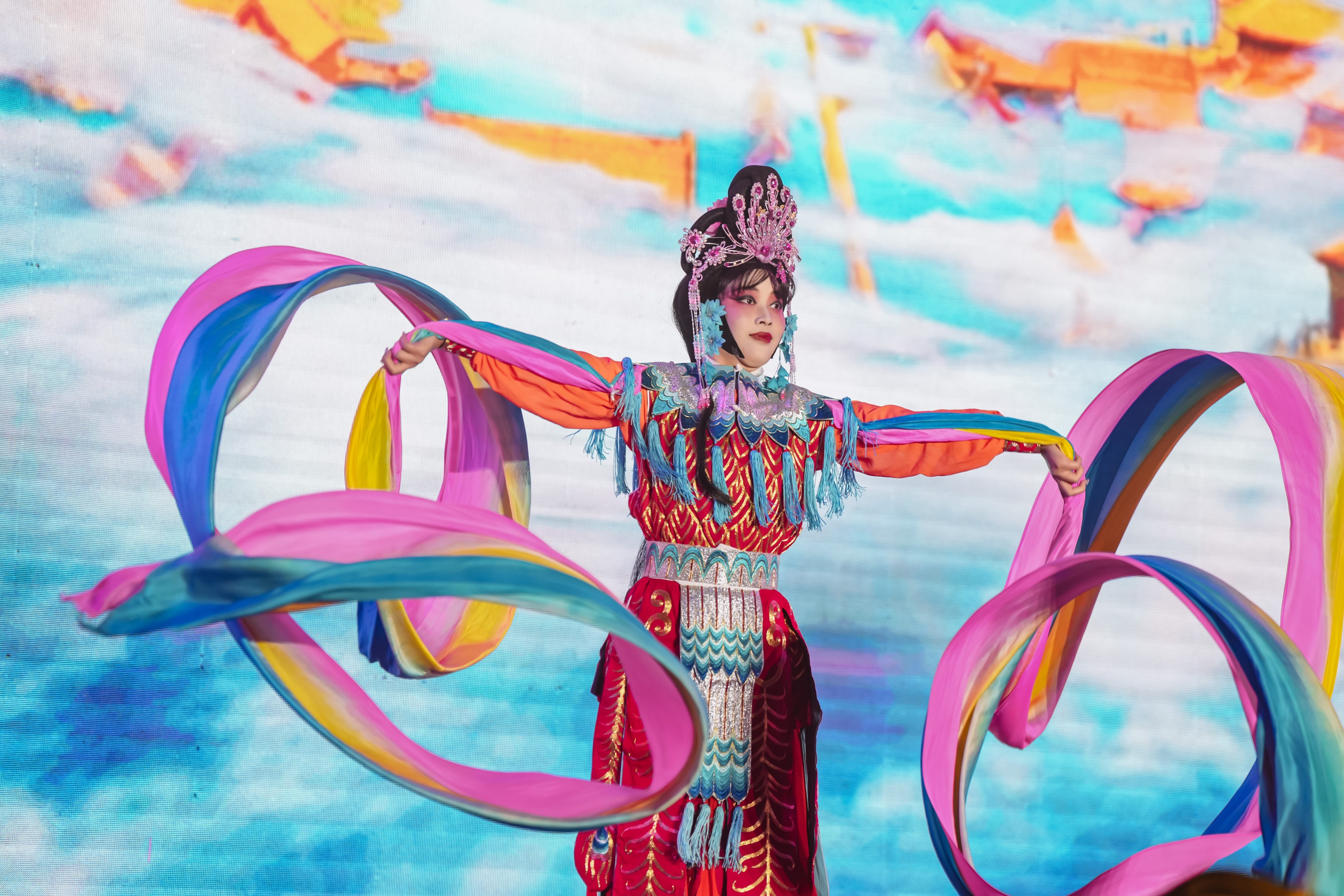 晚7点半,一场以“此心安处,圆梦吾乡”为主题的展演精彩呈现。“凤兮凤兮归故乡,遨游四海求其凰。”伴随着悠扬的古乐奏响,西汉时期司马相如和卓文君才子佳人的故事以情景剧的形式重现。来自四川省曲艺团多位国家一级演员组成的表演团队,融合四川传统戏曲、变脸、吐火、长绸舞、俏花旦等元素,带来一场具有浓郁四川特色的表演,展开一幅天府蜀韵画卷。此外,舞蹈、民乐演奏、乐队表演等多个节目精彩上演。