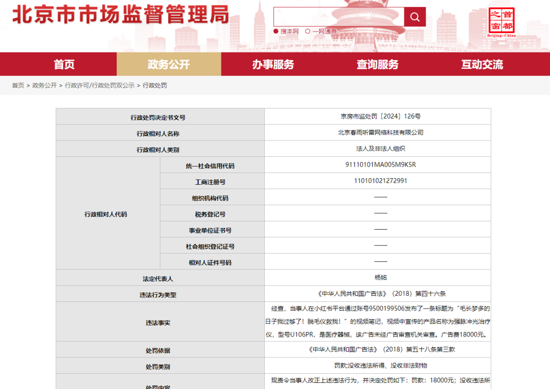 近日,青眼从北京市市场监督管理局官网获悉,北京春雨听雷网络科技有限公司(下称“春雨听雷”)旗下达人在发布一则宣传强脉冲光治疗仪的视频笔记时,因广告违法被北京市房山区市场监督管理局合计罚没3.6万元。