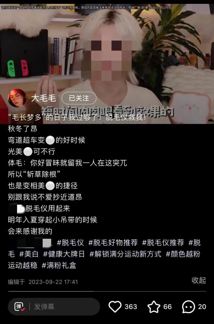 在该视频中,“大毛毛”介绍道,秋冬是美白的好时节,同时也需做好脱毛。在所有脱毛仪中,家用脱毛仪最能在短时间内肉眼看到效果。在视频的后半部分,“大毛毛”着重介绍了某品牌脱毛仪,称该脱毛仪能量足够大,而且有临床报告实测,值得入手。而截至发稿,已无法搜到该视频。