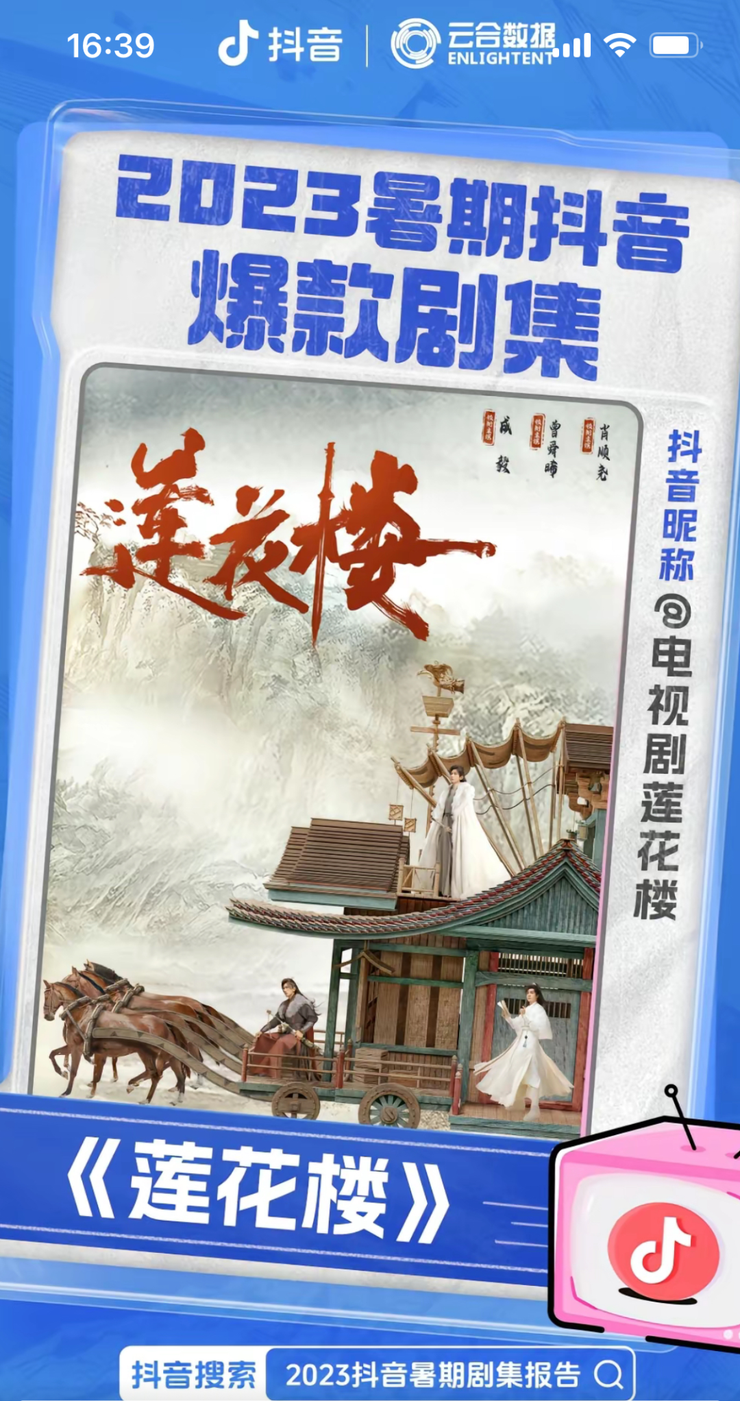 在抖音剧宣实操层面,爱奇艺通过多部剧集积累了丰富经验,无论是账号的长期运营还是热点内容的破圈,皆有出圈案例可供借鉴。以去年暑期在爱奇艺热播的古装武侠剧《莲花楼》为例,通过抖音官号的拟人化经营打造剧集核心讨论阵地,2023年累计收获了182万粉丝,作品获赞量达1亿+,多支爆款短视频下出现剧粉暖心长评,也被官方认证为“2023暑期抖音爆款剧集”。