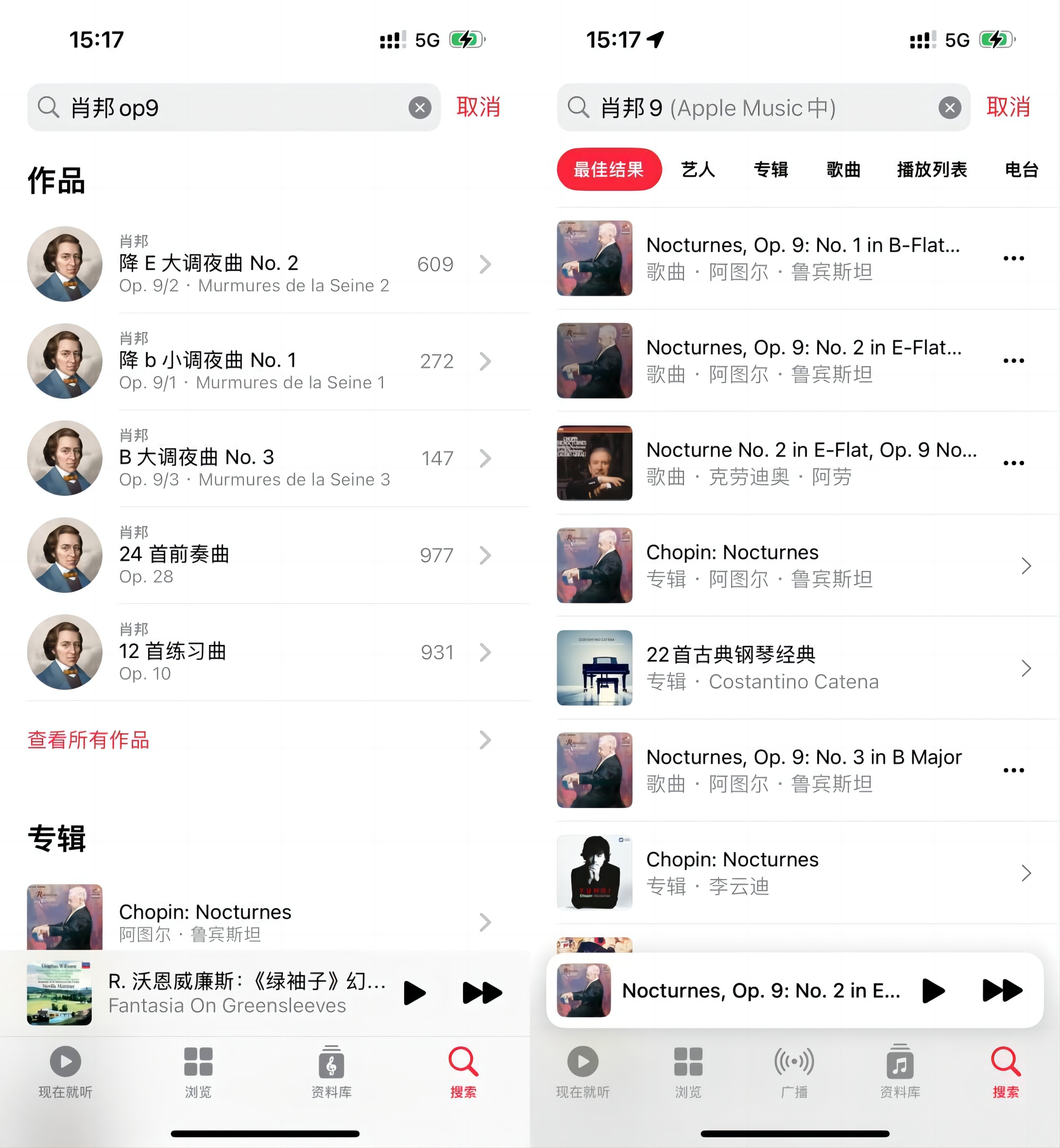 比如我们在Apple Music古典乐中搜索“肖邦9”,实际上就是指向肖邦在1832年出版的第二首《降E大调夜曲》(Nocturne in E Flat, Op. 9 No. 2)。Apple Music古典乐给出的第一搜索结果也是一致(下左图),给到了第二首《降E大调夜曲》的609个版本。