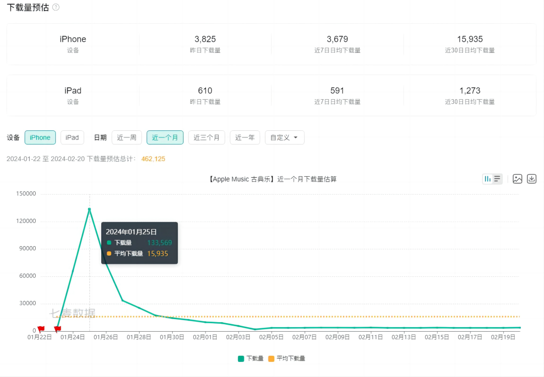 从下载量上,近一个月来,Apple Music古典乐平均下载量为每天1.6万。如果刨去上线初期的热潮,平均下载量只有每天4500左右。