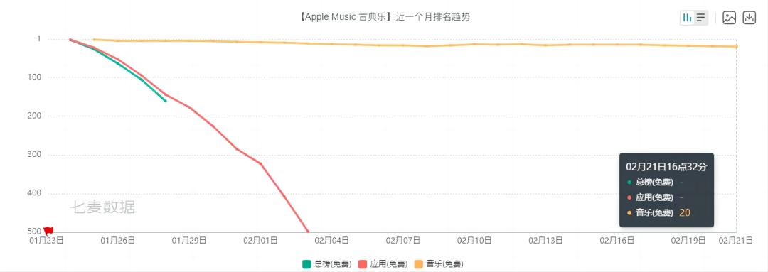 七麦数据显示,一个月后,它除了在音乐榜单上稳定在20名左右,在总榜和应用榜上已经不见踪迹。
