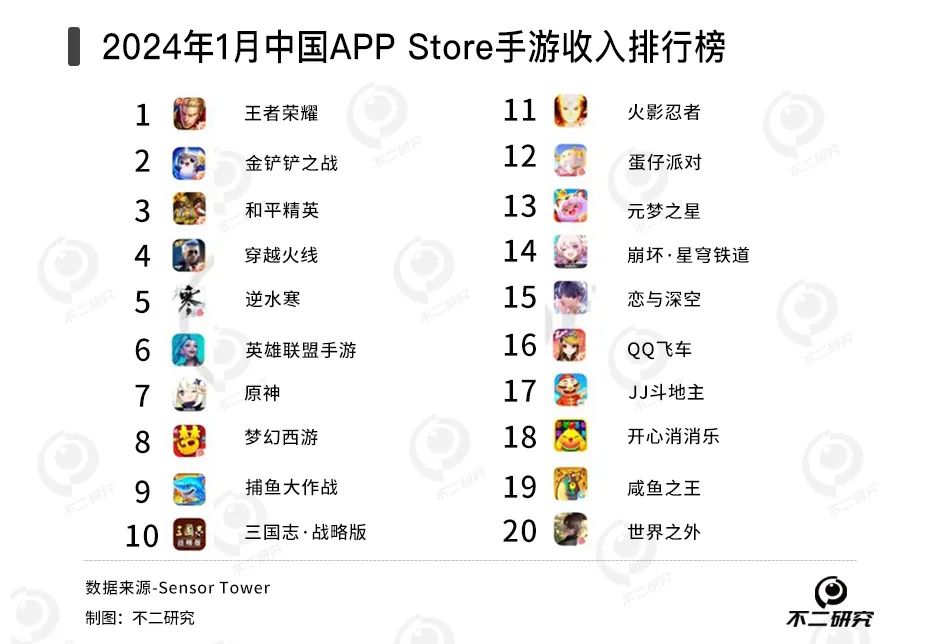 根据2024年1月中国区App Store 手游收入榜,排名前20的游戏产品腾讯、网易各占有9款、3款;其中,腾讯的《王者荣耀》《和平精英》、网易的《逆水寒》位列前三。