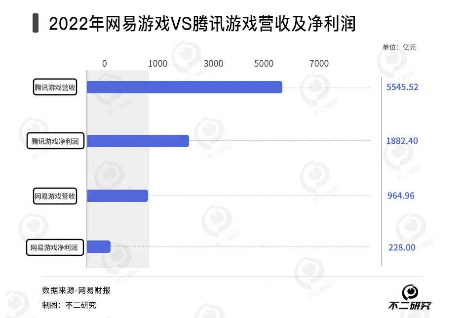 若拉长时间线,网易游戏2022年的净利润为228亿,同比降低6%;腾讯游戏的净利润1882.4亿元,同比下降16%。