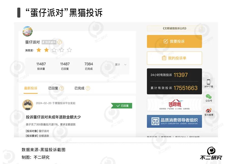 「不二研究」发现,截至2024年2月20日,以“蛋仔派对”为关键词进行检索,投诉数量累计有17633条,其中,投诉原因大多数与未成年人充值且退款难有关。