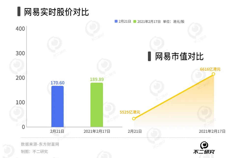 截至2月21日港股收盘,网易报收171.40港元/股,对应市值5525亿港元(约折合人民币5079亿元;对比2021年2月的市值高点6616亿港元,其市值已经蒸发1091亿港元(约折合人民币1027亿元)。