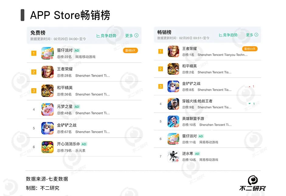 在今年春节游戏流量大战之后,网易能否凭借《蛋仔派对》打破“千年老二”的魔咒?由此,「不二研究」更新了此前9月旧文的部分数据和图表,以下Enjoy: