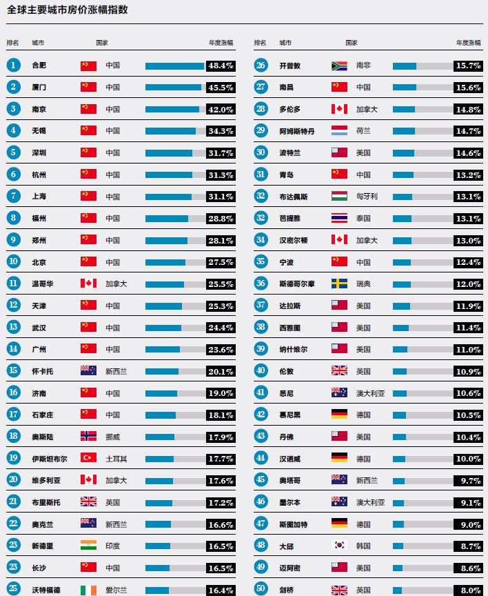 房价涨幅最高的前50名城市共来自17个国家,其中中国最多,有19个城市进入前50,其次是美国6个、加拿大4个、德国、新西兰和英国各3个,澳大利亚2个,爱尔兰、韩国、荷兰、南非、挪威、瑞典、泰国、土耳其、匈牙利和印度各1个。