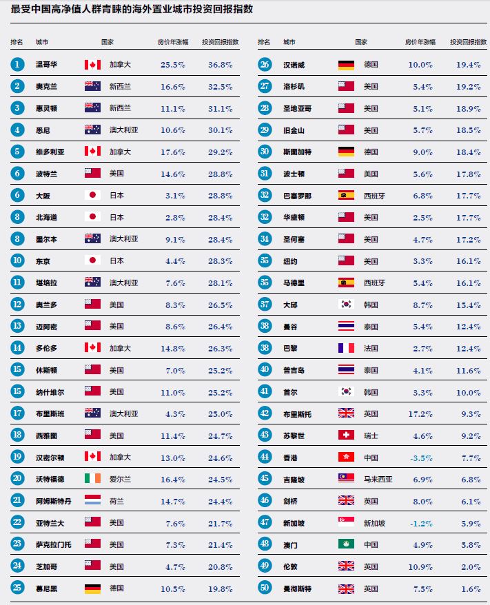 前50名投资回报率最高的城市共来自17个国家,其中美国最多,有16个城市进入前50,其次是澳大利亚、加拿大和英国各有4个,德国和日本各有3个,韩国、泰国、西班牙、新西兰和中国各有2个,爱尔兰、法国、荷兰、马来西亚、瑞士和新加坡各有1个。