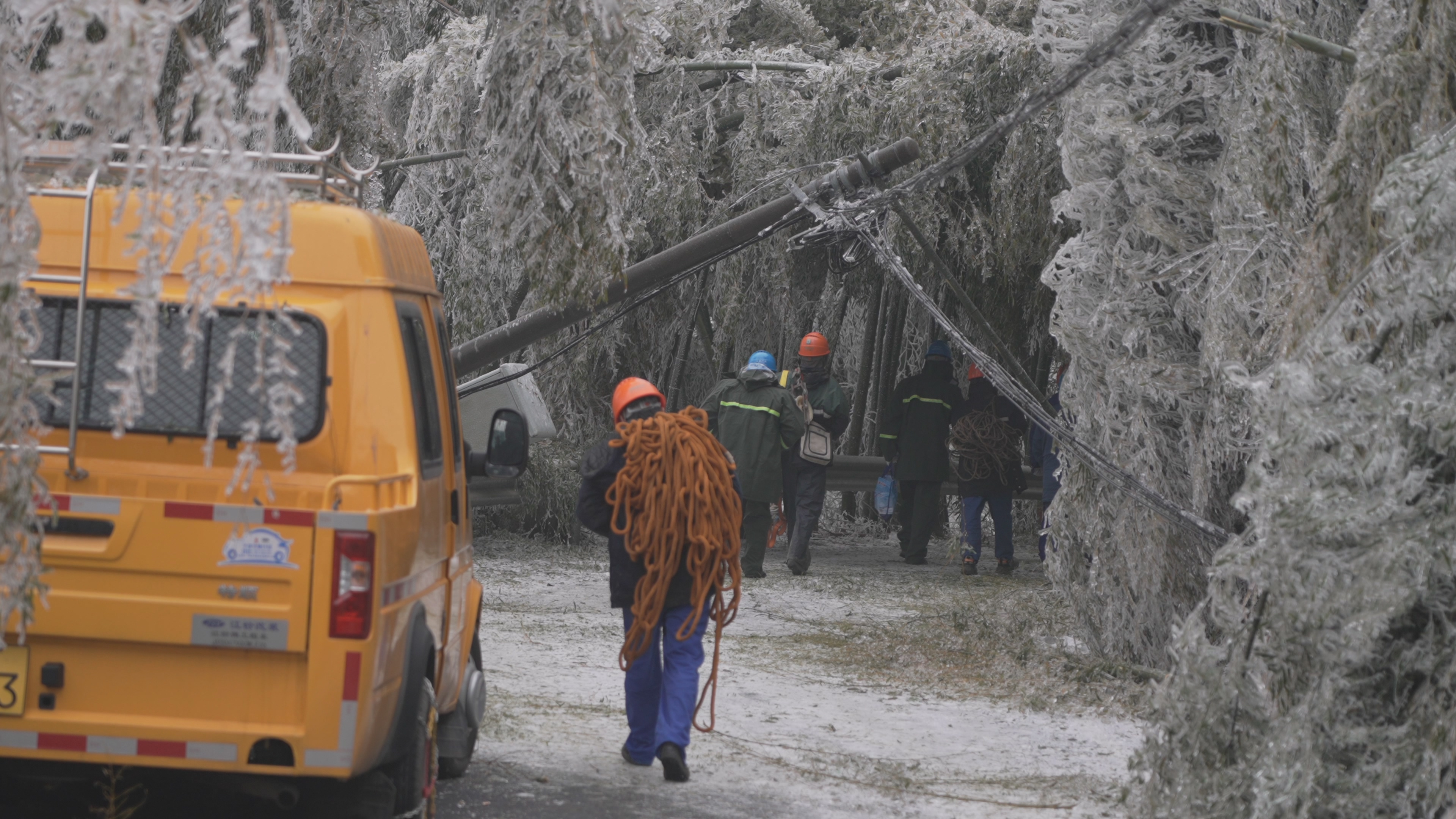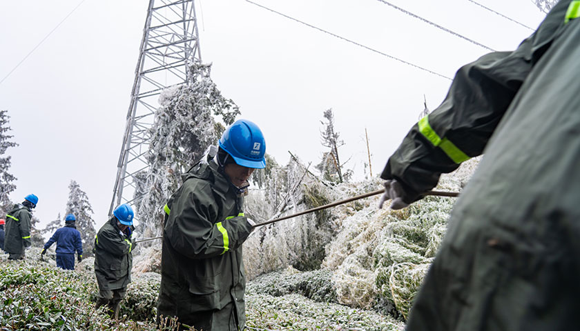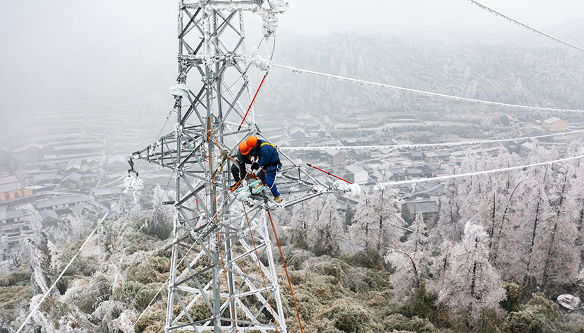 塔上覆盖着厚厚的冰,抢修队员要先用锤子敲掉塔上的覆冰。由于寒冷,平时很容易的登塔动作因手脚受冻而变得困难。拆装金具、架设导线、校正弧垂……抢修队员专注于手头的工作,全然顾不上冻红的脸、冻麻的手、冻僵的脚。