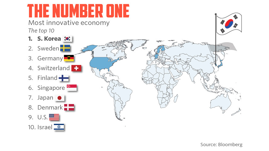 由于在专利活跃度、高等教育、高附加值制造业等细分指标上的领先,拥有三星、现代等公司的韩国,再次被彭博评为最具创新精神的经济体。