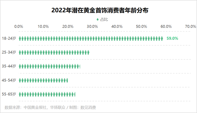 据《2022年中国黄金首饰消费行业消费洞察报告》显示,从2016年到2021年,青年人购置黄金的比例已从16%增长至59%,成为各年龄群金饰消费潜力榜首。