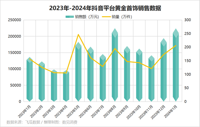 抖音平台上,2023年1月-2024年1月,黄金首饰销售额及销量呈波动上涨趋势,今年1月黄金销量同比增长31.56%,销售额同比增长64.05%。