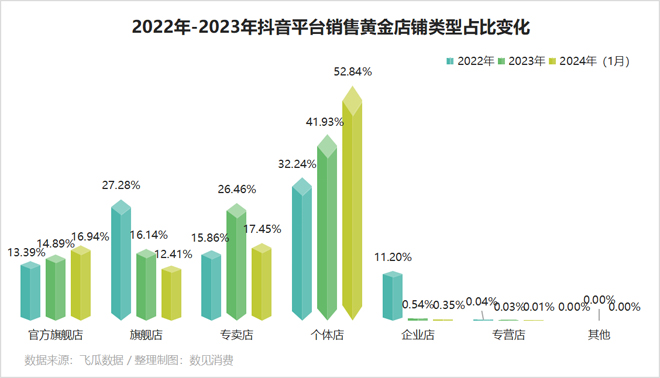 从2022年开始,黄金首饰个体店铺的占比在不断上升,而旗舰店及企业店的占比逐渐下降。越来越多的个体户盯上了黄金首饰这块大蛋糕。在电商平台对个体店铺的流量扶持下,消费者们购买黄金的选择变多,商品价格空间变大,更易达成交易。