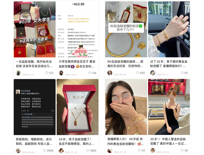 话题#年轻人为什么开始爱买黄金#冲上了微博热搜,引发超7000万人关注讨论;春节期间,抖音上话题#胖东来黄金柜台被抢购一空#的话题视频播放量超2000万,“没有加工费”的噱头,让无数年轻人为之疯狂;小红书平台晒黄金首饰的90后,00后比比皆是,更是自我调侃——年轻人购买黄金的行为是“血脉觉醒”。