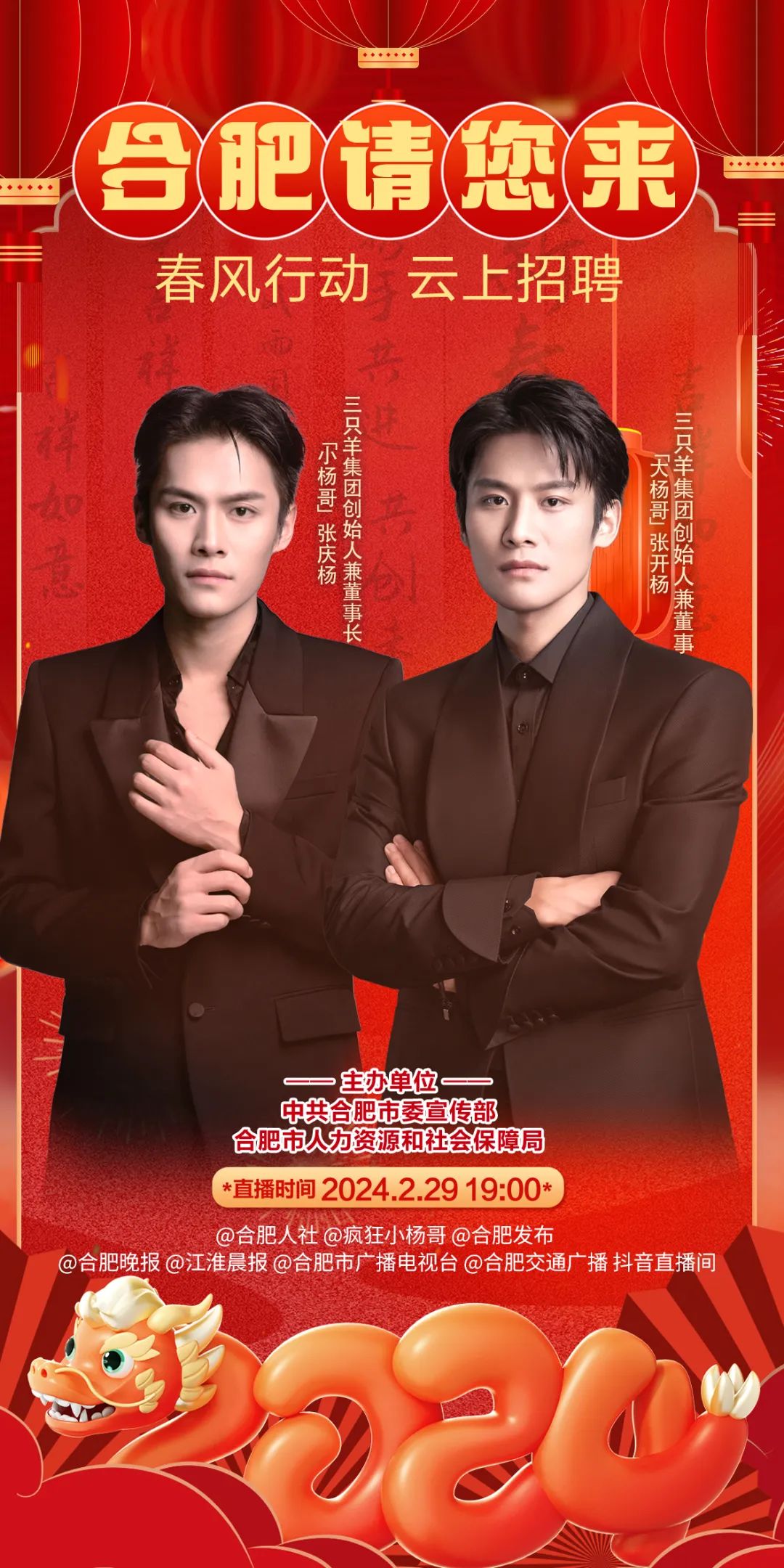 今年,知名网络达人“小杨哥”张庆杨、“大杨哥”张开杨,将再次走进直播间,为比亚迪、京东方、维信诺、大众汽车、国轩高科、老乡鸡6家企业进行直播带岗。在合肥市公共就业信息共享平台上,有400多家企业的6万多个岗位同步上线。届时,求职者可以通过合肥人社、疯狂小杨哥、合肥发布、合肥晚报、江淮晨报、合肥市广播电视台、合肥交通广播抖音直播间,还可以通过合肥通客户端、合意客户端观看直播,与企业HR进行沟通,了解企业招聘信息、参与实时答疑互动、选择自己心仪的企业与岗位。