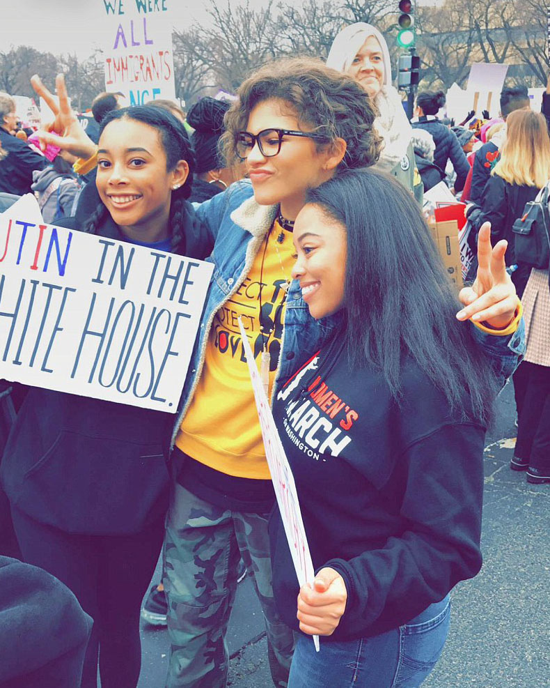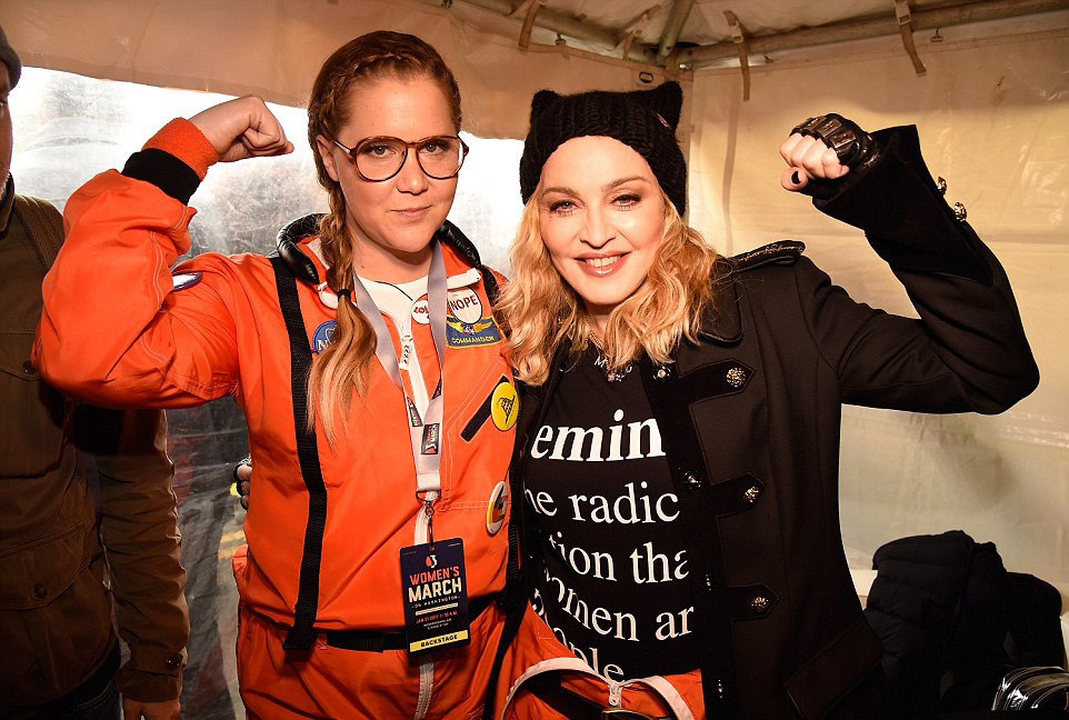 女星艾米·舒默与麦当娜。艾米·舒默当天的服装与她在个人节目《艾米·舒默的内心世界》采访天体物理学家奈尔·德葛拉司·泰森(Neil deGrasse Tyson)时的服装一样,右手戴上了印有“Wear Orange”字样的护腕以响应游行意图,旨在提高人们对枪支暴力的认识。麦当娜也穿了相同的服装,并在游行活动中发表讲话,呼吁女性及少数群体为个人权利抗争,大呼“此等可怕的黑暗时刻正是要我们觉醒。”