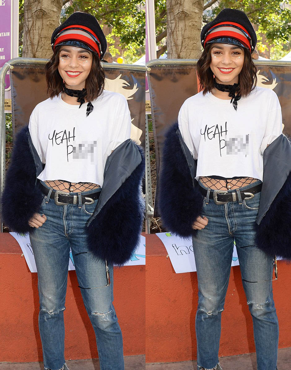 凡妮莎·哈金斯身着印有“p****”字样的上衣讽刺特朗普言论。
