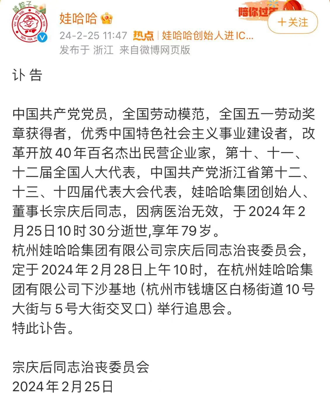 2024年2月25日11点,娃哈哈发布讣告:娃哈哈创始人、董事长宗庆后同志,因病医治无效,于2024年2月25日10时30分逝世,享年79岁。