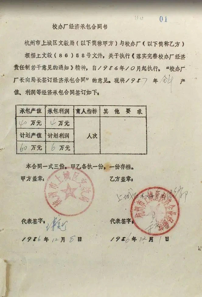 直到1987年,杭州上城区文教局改革决定将校办企业的经销部由私人来承包,但有一个前提条件:承包者必须承诺完成年产值40万元,上交利润4万元。[5]4万元是什么概念呢?那个时候,钱还是按分算,作业本、橡皮只需要几分钱,4万元甚至可以买一套房子。