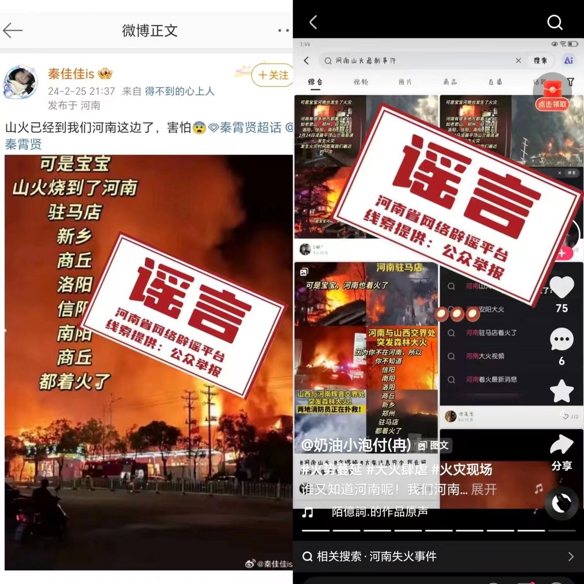 据河南省网络辟谣平台2月26日消息,近日,微博用户@秦佳佳is、视频平台用户奶油小泡付(冉)等账号发布“山火烧到了河南”信息,并配上多张火灾图片。经河南省网络辟谣平台向省林业局等相关部门核查,截至2月26日河南省域内未发生山火,网传信息为谣言。请广大网民不信谣、不传谣。