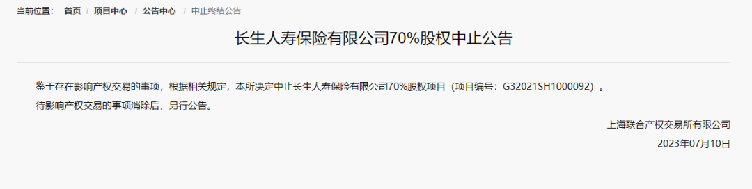 根据上海联合产权交易所信息,2021年9月18日,意向受让方资质审查过程中出现影响产权交易的事项;2023年2月15日,股权转让中止则是因部分股权已被法院冻结;最近一次中止时间是2023年7月10日,鉴于存在影响产权交易的事项,根据相关规定,中止长生人寿70%股权项目。