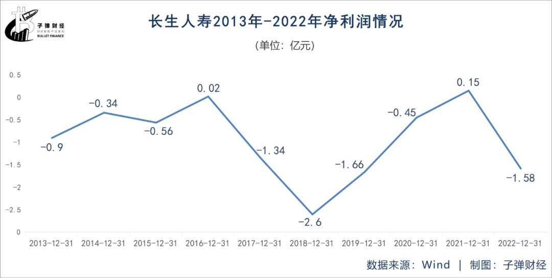 2013年-2022年,长生人寿的净利润分别为-0.90亿元、-0.34亿元、-0.56亿元、0.02亿元、-1.34亿元、-2.60亿元、-1.66亿元、-0.45亿元、0.15亿元及-1.58亿元。