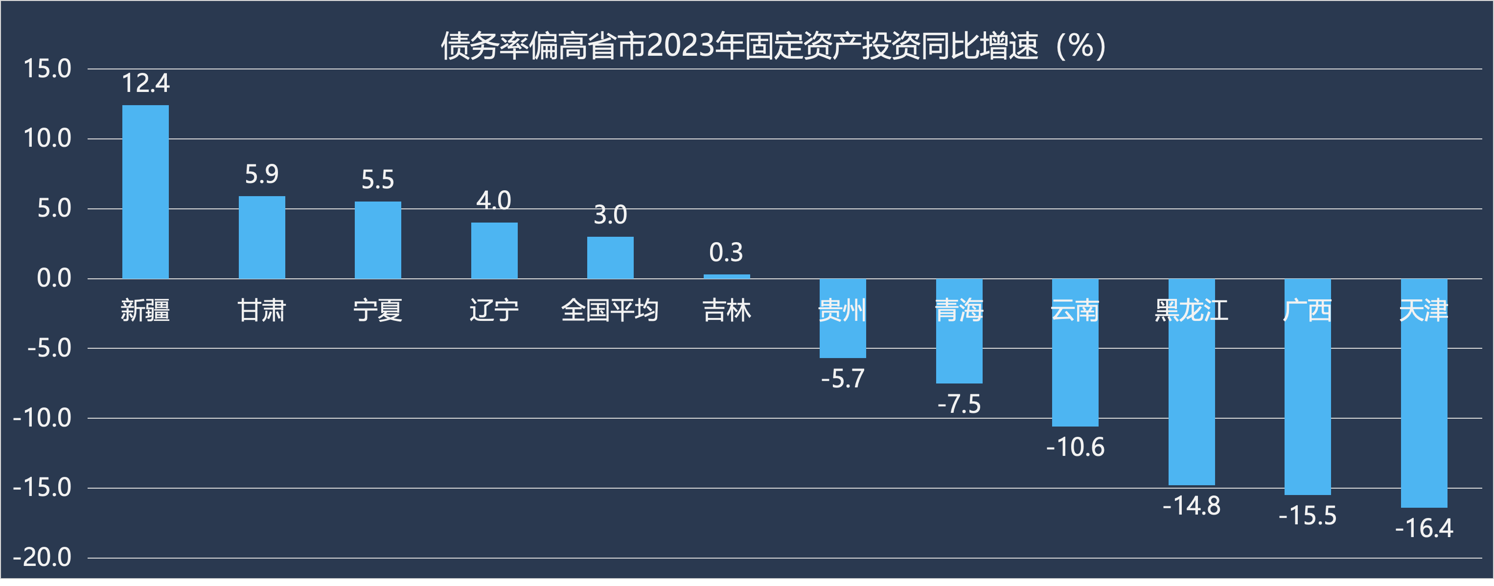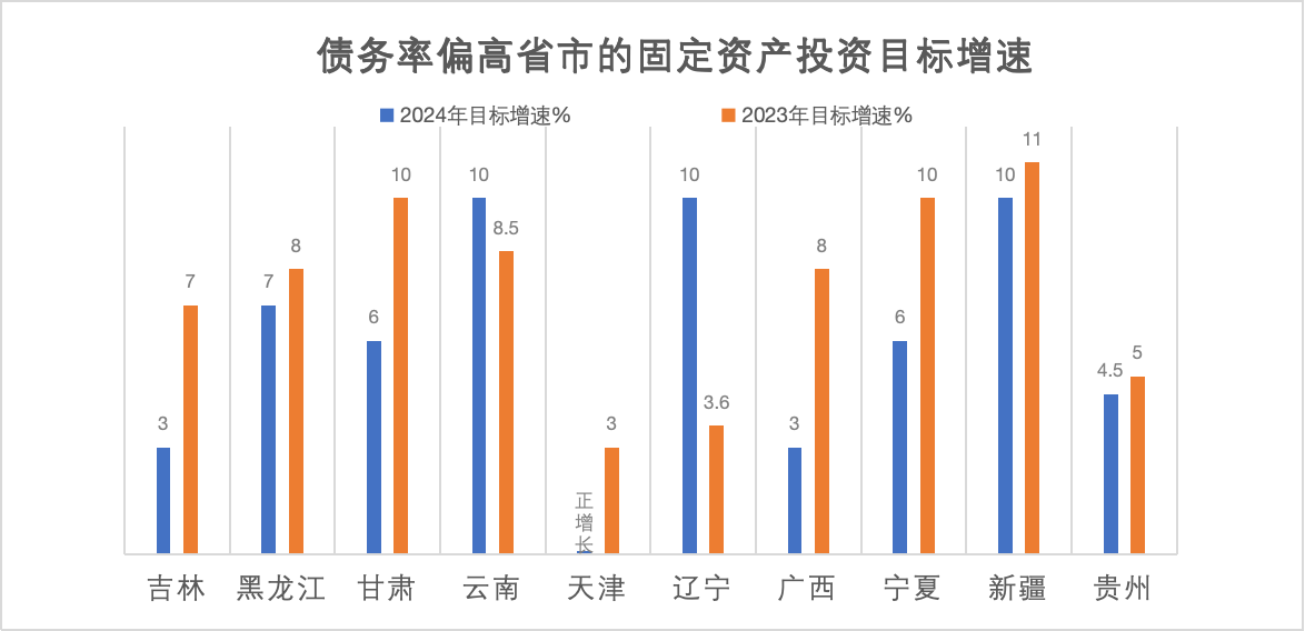 在化债背景下,上述11个债务率超过300%的省份中,只有辽宁省上调了2024年固定资产投资目标增速,其余均下调了目标增速,比如,吉林省将目标增速从2023年的7%下调至3%,广西将目标增速从上年的8%下调至3%。