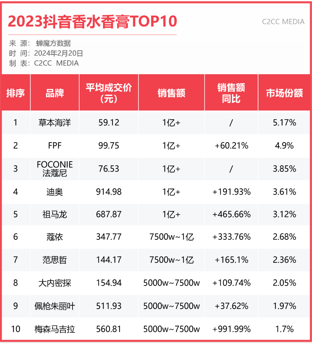 蝉魔方数据显示,2023年,抖音香水香氛销售额突破34亿元,销售额同比增长超80%。其中,男士香水/香膏同比增长超1000%。TOP10品牌市场份额超30%,当中,国货品牌GMV占TOP10品牌总GMV的50%。