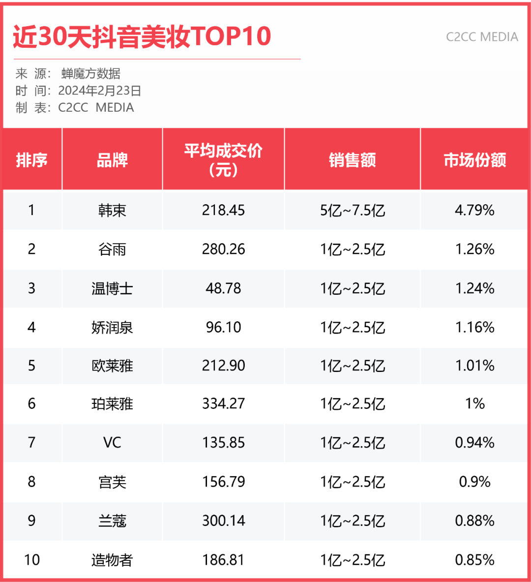 这类美妆白牌还不在少数,均价90元左右的“娇润泉”就是其中一个。去年下半年,抖音美妆护肤类目中,娇润泉以超10亿的GMV领先雅诗兰黛排名第4。今年1月,VC、娇润泉两个品牌的月销售额也均超1亿。