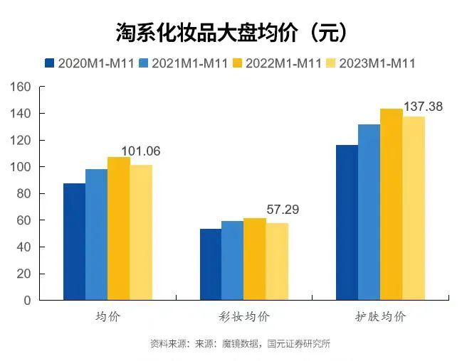 根据国元证券研究所、魔镜数据,2023年淘系化妆品大盘均价在百元左右,其中,护肤均价137.38元,彩妆均价57.29元, 相比前一年都有所下滑。结合房地产冷清、股市低迷,出口持续下滑等严峻的经济大势,有资深业内人士预测,今年化妆品大盘的价格中枢或继续下移。