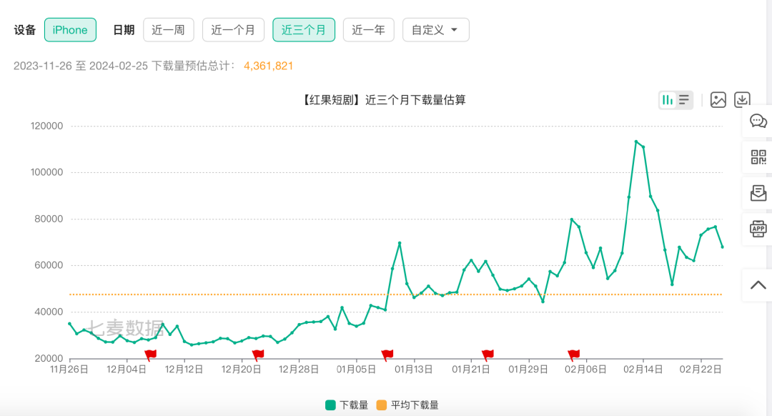红果短剧近3月的下载量预估。来源:七麦数据。