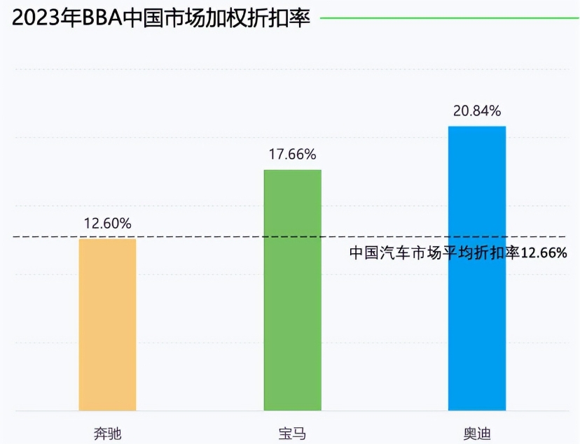 2023年是BBA开始深度参与价格战的一年。它们折扣率甚至已经超过行业,其中,奔驰平均折扣率与行业相当,宝马打折比行业平均水平高出5个百分点,奥迪更是化身“八折迪”。