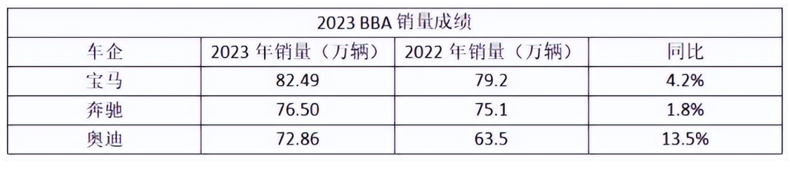 过去两年,BBA在中国有两幅面孔。舆论上,大家对BBA的信仰正集中崩塌,甚至出现了“再不努力,就只能开BBA了”的论调。但BBA的销量没有输,2023年宝马、奔驰、奥迪销量分别同比增长4.2%、1.8%、13.5%。