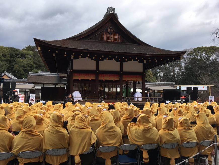 前几天的京都下鸭神社,突然出现了两百多个身着黄色披肩的神秘集会群众,端正地坐在神社的神服殿前参拜。如果你仔细看会发现,这并不是什么宗教仪式——他们只是把自己打扮成了黄色的毛绒绒狸猫。