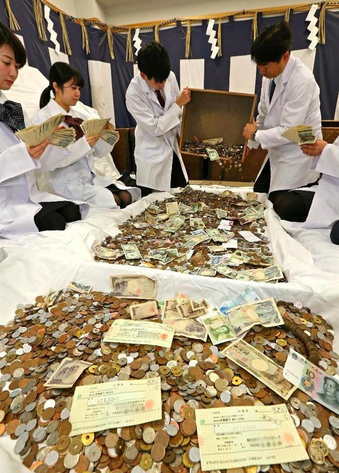 那些人气旺的著名大社,收入一向可观。同在京都的伏见稻荷大社每年1月初都是最繁忙的数钱时期——它不但因为“千鸟居”长居京都旅游地标前三名,还因为是掌管五谷粮食的稻荷神社深受本地人欢迎,每年都有百万群众在日本新年来伏见稻荷大社参拜,新年过后,神社工作人员光是数来自各国的钱币就要花整整一星期。即使是平日,游客带来的收入也是个庞大的数字。