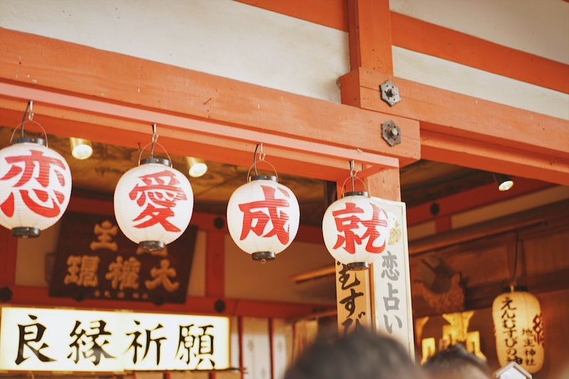 如今这个位于半山腰的小神社总是挤满了来求恋爱顺利的年轻人。而地主神社出售的御守也非常投年轻人所好——他们出售许多种不同的恋爱御守,保佑恋爱顺利、保佑丘比特之箭射向喜欢的人、保佑遇到良人、保佑结婚等等,总有一款恋爱御守适合你的感情状态。