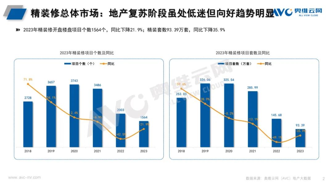 2023年是疫后重启第一年,中国房地产处于复苏阶段,虽处低迷但降幅逐渐收窄,呈现向好趋势。据奥维云网(AVC)监测数据显示:2023年中国房地产精装修市场新开盘项目1564个,同比下滑21.9%,降幅收窄20.6个百分点,市场规模93.39万套,同比下滑35.9%,降幅收窄13.2个百分点。其中厨电整体(烟机、灶具、消毒柜、洗碗机、单功能机、一体机)精装市场开盘项目1524个,同比下滑21.2%,降幅收窄21.5个百分点,市场规模253.15万套,同比下滑32.9%,降幅收窄13.4个百分点。