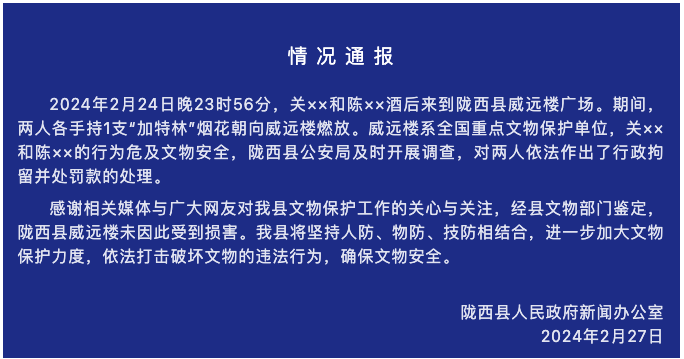 2月27日,甘肃陇西县人民政府新闻办公室通报,2月24日晚23时56分,关××和陈××酒后来到陇西县威远楼广场。期间,两人各手持1支“加特林”烟花朝向威远楼燃放。威远楼系全国重点文物保护单位,关××和陈××的行为危及文物安全,陇西县公安局及时开展调查,对两人依法作出了行政拘留并处罚款的处理。经县文物部门鉴定,陇西县威远楼未因此受到损害。