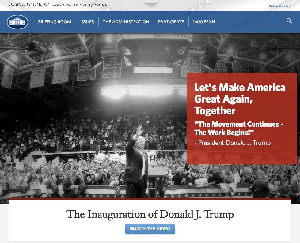就在美国总统特朗普上周五宣誓就职后不久,白宫官网的页面也悄无声息地彻底改头换面,变成了特朗普关于一系列政策承诺的行动计划。