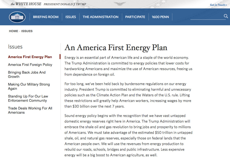 在能源方面,特朗普誓言要废除“有害且不必要的政策”,如《气候行动计划》(Climate Action Plan)和《美国水务》(Waters of the United States)。前者代表了奥巴马为了降低美国温室气体排放所做的许多努力,后者是环境保护署为了保护大型水道和小型支流颁布的。有人认为,小型支流应该归在各州而不是联邦政府的司法管辖范围内。